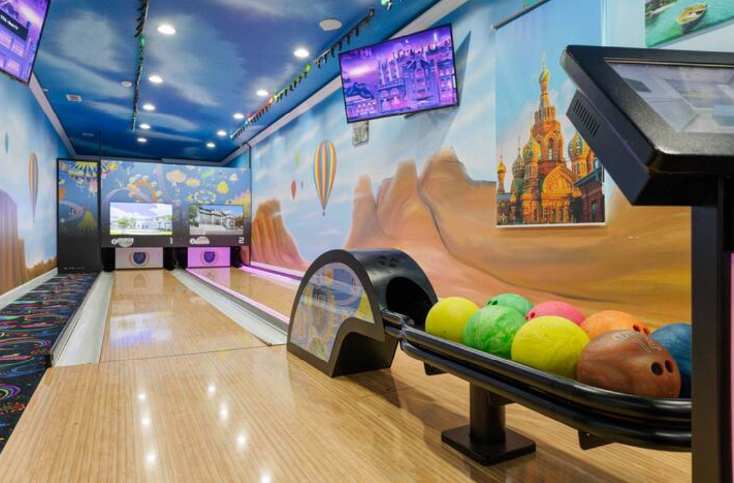 There are 12 rooms with king beds; 1 room with 2 full-over-full bunk beds; and 1 room with 2 full-over-full bunk beds, for a total number of beds: 20. The house sleeps up to 40 people.Indulge in endless entertainment options with your private bowling alley, pool-side TV, wall-to-wall TV in the living room, pool table, arcade games, and a home theater complete with a 4k 120-inch TV screen. The open-concept living room space is perfect for entertaining guests with a premium quality audio system, while all 14 bedrooms feature Smart 4k TVs and plush carpeted floors.
